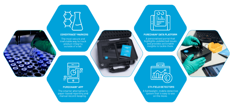 PURECHAIN®’s interconnected in-product marker technologies and next-generation detectors secure and protect fuel supply chains from end-to-end, consisting of 4 major components: Covertrace® Markers, the PURECHAIN® Data Platform, CT4 Field Detectors & the PURECHAIN® App.